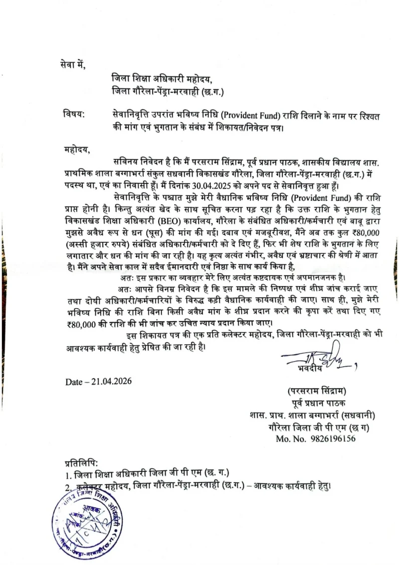 ताजा मामला एक सेवानिवृत्त प्रधान पाठक परसराम सिंद्राम से जुड़ा है, जिन्होंने जिला शिक्षा अधिकारी को लिखित शिकायत देकर आरोप लगाया है कि उनकी वैधानिक भविष्य निधि (Provident Fund) की राशि दिलाने के नाम पर उनसे अवैध रूप से पैसे की मांग की गई।