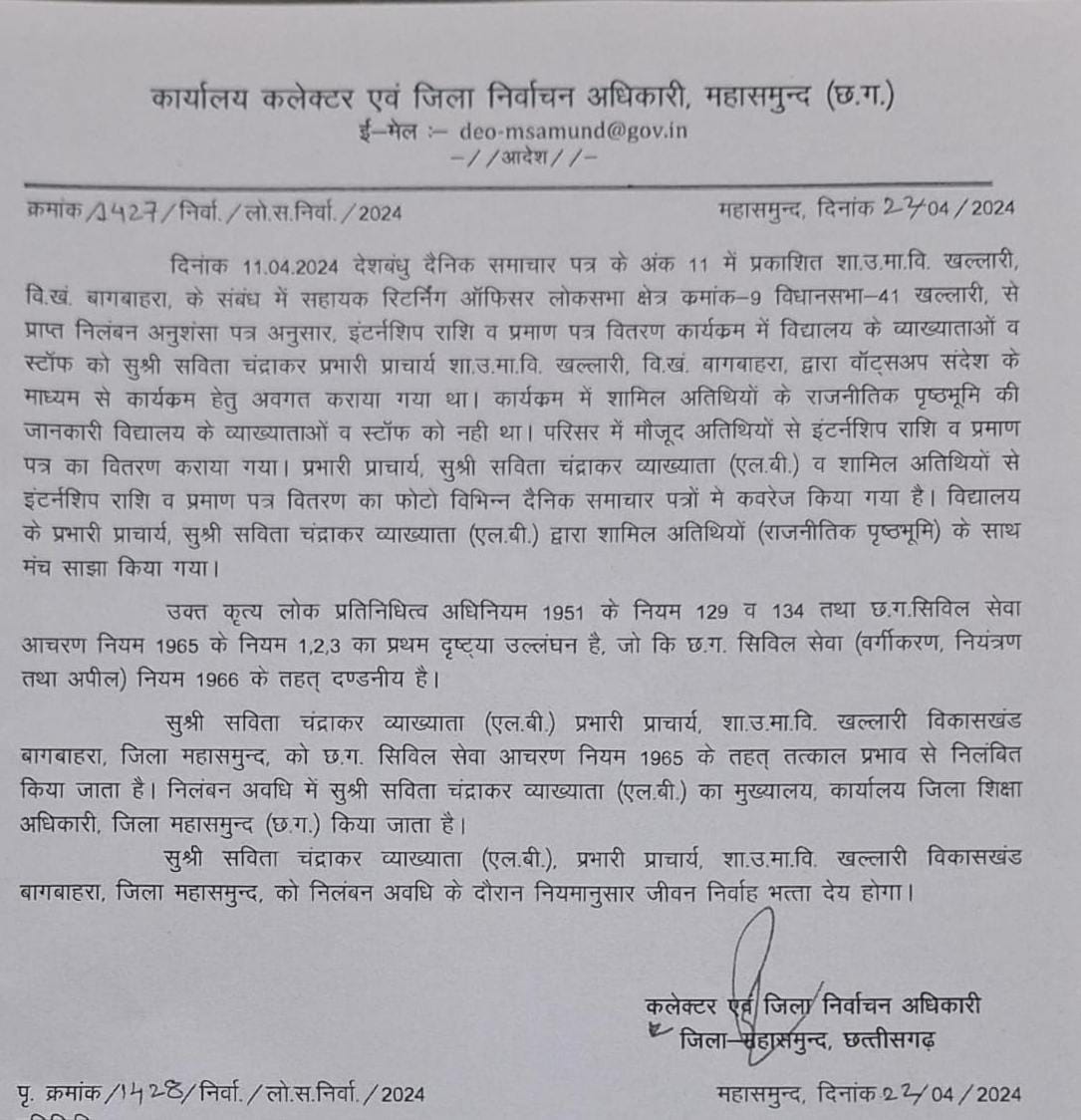 महासमुंद/बता दें कि कलेक्टर एवं जिला निर्वाचन अधिकारी प्रभात मलिक ने व्याख्याता सविता चंद्राकर को निलंबित कर दिया है बता दें कि व्याख्याता सविता चंद्राकर ने इंटरनल सी राशि व प्रमाण पत्र वितरण कार्यक्रम में राजनीतिक पृष्ठभूमि के लोगों के साथ मंच साझा किया था,