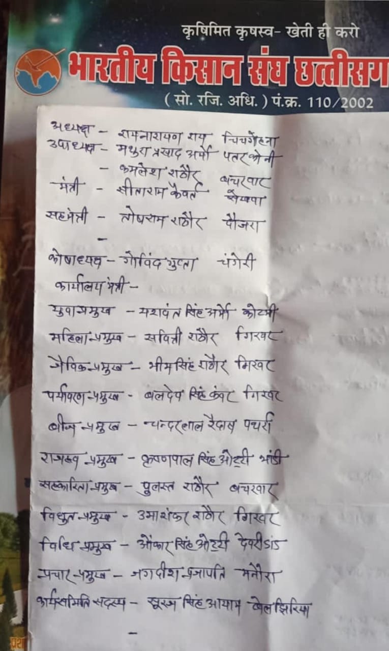 भारतीय किसान संघ छत्तीसगढ़ प्रदेश की बैठक कार्यक्रम हुआ सम्पन विशेष पद से हुए मनोनीत देखे लिस्ट।