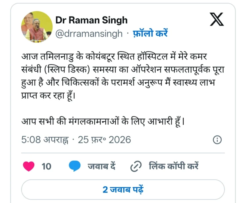 बताया जा रहा है कि लंबे समय से रीढ़ से जुड़ी समस्या के कारण उन्हें चिकित्सकीय सलाह पर सर्जरी करानी पड़ी। विशेषज्ञ डॉक्टरों की निगरानी में यह ऑपरेशन किया गया, जिसे एक नियमित और सफल चिकित्सा प्रक्रिया बताया गया है। सूत्रों के अनुसार, डॉक्टरों द्वारा निर्धारित आराम की अवधि पूरी होने के बाद मार्च के दूसरे सप्ताह से डॉ. रमन सिंह के पुनः विधानसभा अध्यक्ष पद की जिम्मेदारी संभालने की संभावना जताई जा रही है। उनके शीघ्र स्वस्थ होने की कामना पार्टी नेताओं, जनप्रतिनिधियों और समर्थकों द्वारा की जा रही है।