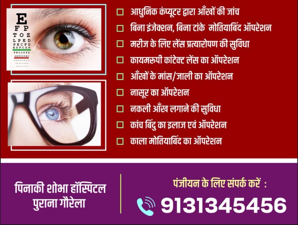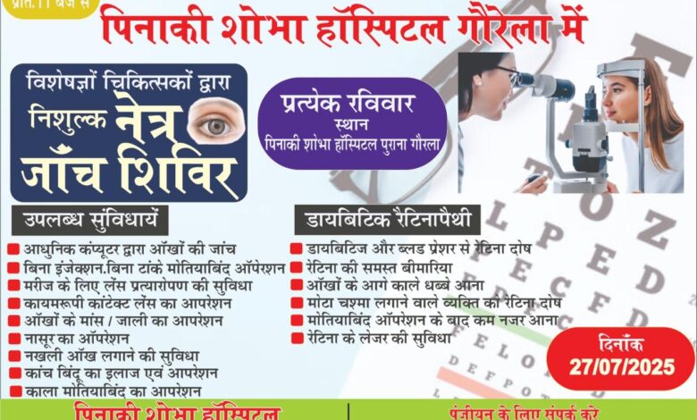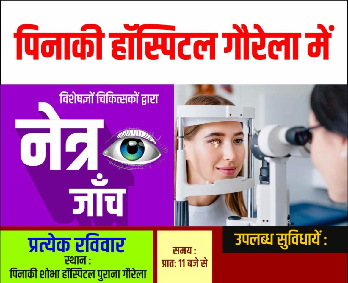 लहसिया देव फाउंडेशन के सौजन्य से पिनाकी शोभा हॉस्पिटल गौरेला में विशेषज्ञ चिकित्सकों द्वारा निःशुल्क नेत्र जांच शिविर