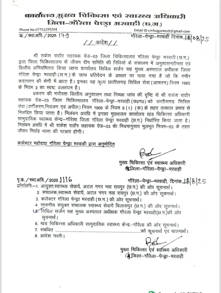 मुख्य चिकित्सा एवं स्वास्थ्य अधिकारी द्वारा जारी आदेश में साफ लिखा गया है कि जीवनदीप समिति के संचालन में वित्तीय अनियमितता और गबन के आरोप जांच प्रतिवेदन में सही पाए गए हैं, जो गंभीर कदाचार की श्रेणी में आते हैं। इसी आधार पर छत्तीसगढ़ सिविल सेवा (वर्गीकरण, नियंत्रण एवं अपील) नियम 1966 के तहत तत्काल प्रभाव से निलंबन की कार्रवाई की गई है।
