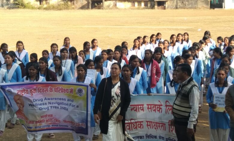 जीशान अंसारी की रिपोर्ट, बिलासपुर:  चेतना विरुद्ध नशा मुक्ति अभियान कार्यक्रम का आयोजन आज दिनांक 08.01.2026 को माननीय न्यायिक मजिस्ट्रेट प्रथम श्रेणी कोटा श्रीमती दीप्ति बरवा की उपस्थिति में शासकीय कन्या उ. मा. विद्यालय बेलगहना एवं स्वामी आत्मानंद हायर सेकेंडरी स्कूल बेलगहना की छात्र-छात्राओं को नशा मुक्ति चेतना/जागरूकता कार्यक्रम का आयोजन किया गया तथा ग्राम बेलगहना में चेतना नशा विरुद्ध जागरूकता रैली निकालकर ग्राम में भ्रमण कर कार्यक्रम का आयोजन किया गया. छात्राओ और ग्रामीणों को नशे के विरुद्ध,साइबर क्राइम के संबंध में एवम नए कानूनी अधिकार के संबंध में बतला कर जागरूक किया गया। उक्त कार्यक्रम एवम रैली में जिसमे शासकीय कन्या हायर सेकेंडरी स्कूल के प्राचार्य सुश्री कल्पना कुर्रे जी व्याख्याता संगीता दास जी, सावित्री कुर्रे, कृष्ण कुमार, अश्वनी तिवारी एवं स्वामी आत्मानंद शासकीय हायर सेकेंडरी स्कूल के प्राचार्य नागेंद्र कौशिक, अरुण दिवाकर, पुष्पेंद्र करियम श्याम सुंदर तिवारी, बी. एस, राज, शुभ्रा बाजपेई, मालती कश्यप एवं स्कूल के स्टाप उपस्थित रहे. उक्त कार्यक्रम में ASI मोतीलाल सूर्यवंशी, HC नरेन्द्र पात्रे, आरक्षक ईश्वर नेताम, धीरज जायसवाल, अंकित जायसवाल, कौशल बिंझवार की विशेष भूमिका रही,