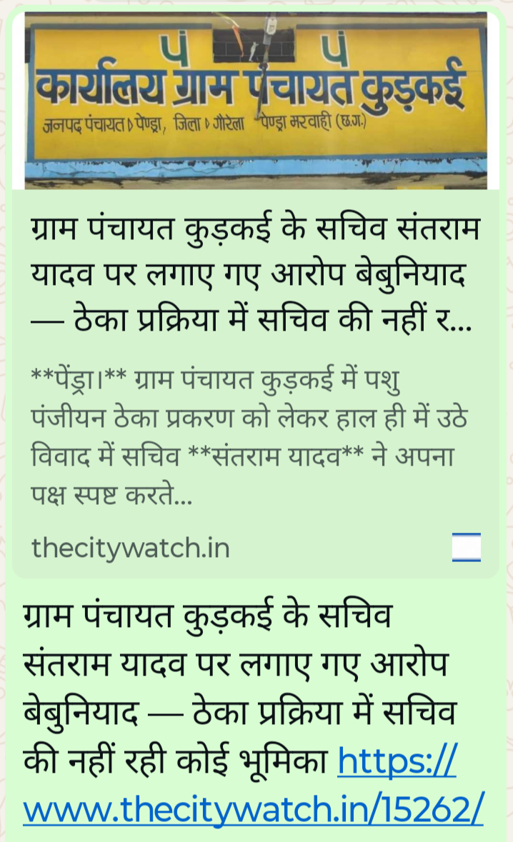पेंड्रा। ग्राम पंचायत कुड़कई के सचिव संतराम यादव एक बार फिर भ्रष्टाचार के गहरे घेरे में हैं। पशु पंजीयन ठेका घोटाला और नाली निर्माण में अनियमितता के मामलों में उनका नाम सामने आने के बाद अब सचिव अपनी भूमिका को बचाने और पुराने विवादों पर पर्दा डालने की कोशिश में जुटे हैं। ग्रामीणों का कहना है कि वे न केवल अपने भ्रष्टाचार को झूठ साबित करने की कवायद कर रहे हैं, बल्कि वर्षों से चले आ रहे विवादों को भी दबाने में लगे हुए हैं।