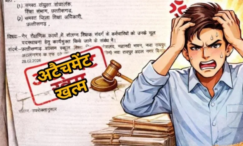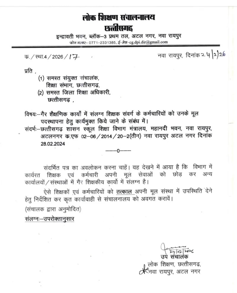 रायपुर/छत्तीसगढ़ में अटैचमेंट समाप्ति को लेकर एक बार फिर बड़ा प्रशासनिक निर्देश जारी हुआ है। लोक शिक्षण संचालनालय, छत्तीसगढ़ ने 24 फरवरी 2026 को स्पष्ट आदेश जारी कर कहा है कि गैर-शैक्षणिक कार्यों में संलग्न शिक्षक संवर्ग के कर्मचारियों को तत्काल उनकी मूल पदस्थापना पर कार्यमुक्त कर भेजा जाए।