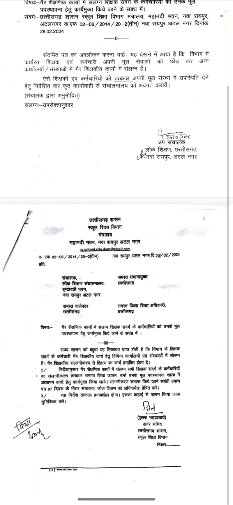 जारी पत्र क्रमांक क./स्था.4/2026/17, नवा रायपुर से जारी इस आदेश में सभी संयुक्त संचालकों और जिला शिक्षा अधिकारियों को निर्देशित किया गया है कि, जो शिक्षक एवं कर्मचारी अपनी मूल सेवाएं छोड़कर अन्य कार्यालयों/संस्थाओं में गैर-शैक्षणिक कार्यों में संलग्न हैं,