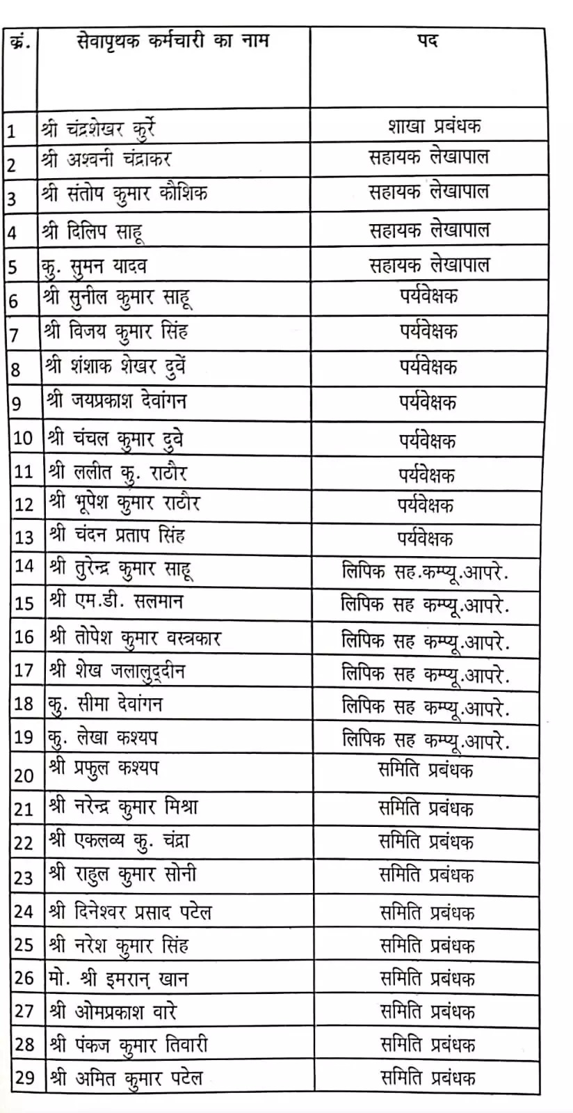 बिलासपुर। जिला सहकारी केंद्रीय बैंक बिलासपुर में बड़े पैमाने पर भर्ती घोटाले का पर्दाफाश होने के बाद 29 कर्मचारियों की सेवा समाप्त कर दी गई है। बैंक की स्टाफ कमेटी की बैठक में यह निर्णय सर्वसम्मति से लिया गया। बर्खास्त कर्मचारियों में 1 शाखा प्रबंधक, 4 सहायक लेखापाल, 8 पर्यवेक्षक, 6 लिपिक सह कंप्यूटर ऑपरेटर और 10 समिति प्रबंधक शामिल हैं।