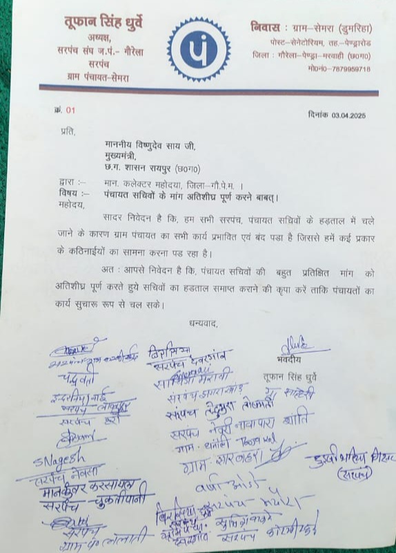 गौरेला पेंड्रा मरवाही : पंचायत सचिवों के सम​र्थन में आये सरपंच संघ ब्लॉक अध्यक्ष तूफान सिंह कहे मांग जायज है।