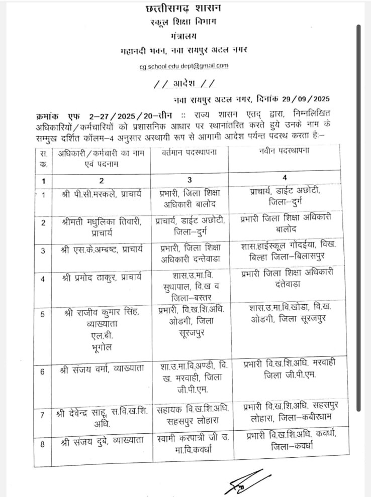 मिथलेश आयम, गौरेला पेंड्रा मरवाही(खबरों का राजा) । छत्तीसगढ़ शासन, स्कूल शिक्षा विभाग ने बड़े पैमाने पर प्रशासनिक फेरबदल करते हुए अधिकारियों और कर्मचारियों का स्थानांतरण किया है। शासन की ओर से जारी आदेश में संबंधित अधिकारियों को तत्काल प्रभाव से नवीन पदस्थापना स्थल पर कार्यभार ग्रहण करने निर्देशित किया गया है।