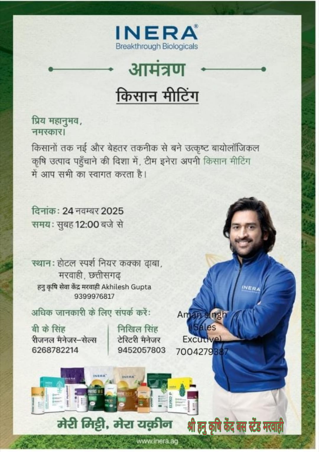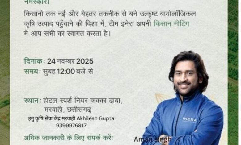 मिथलेश आयम, मरवाही(खबरो का राजा) : किसानों तक नवीन और उन्नत तकनीक से तैयार उच्च गुणवत्ता वाले बायोलॉजिकल कृषि उत्पाद पहुँचाने के उद्देश्य से इनेरा (INERA) कंपनी द्वारा 24 नवंबर 2025 को किसान मीटिंग का आयोजन किया जा रहा है। यह कार्यक्रम सुबह 12 बजे से होटल स्पर्श नियर कक्का ढाबा, मरवाही में आयोजित होगा। कंपनी का कहना है