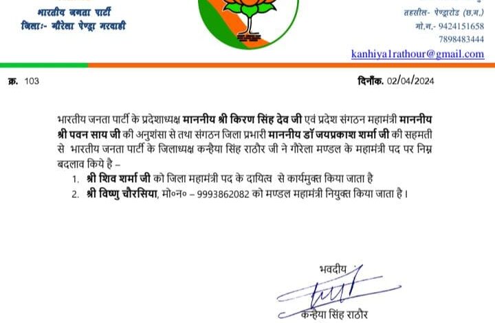 फेरबदल, भाजपा गौरेला मंडल महामंत्री को हटाकर की गई नई नियुक्ति