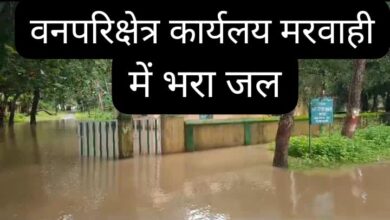क्षेत्र में लगातार झमाझम बारिश, वनपरिक्षेत्र कार्यालय मरवाही के सामने भरा जल