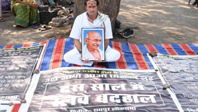 भाजपा के 10 साल में रेलवे बद से बदहाल रायपुर लोकसभा सांसद प्रत्याशी विकास उपाध्याय रायपुर रेलवे प्रांगण के बाहर महात्मा गाँधी जी का शैलचित्र लेकर कर रहे मौन धरना प्रदर्शन