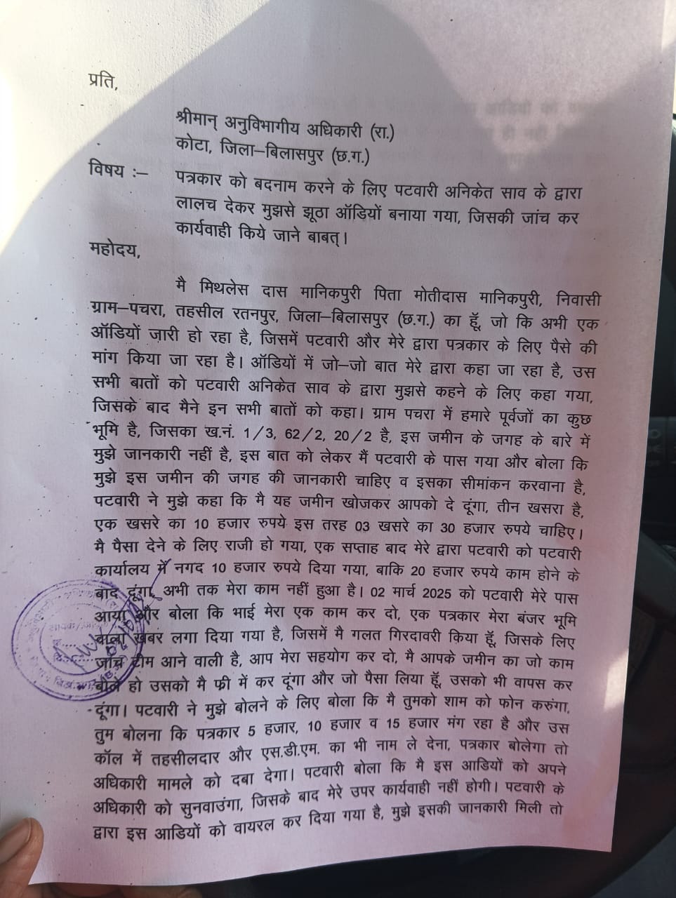 बिलासपुर — रतनपुर तहसील के अंतर्गत ग्राम पचरा में पदस्थरिश्वतखोर पटवारी अनिकेत साव को कल उनके पैसे लेते वीडियो वायरल होने के कारण निलंबित कर दिया गया था, साथ ही पटवारी और एक व्यक्ति को जिसको पचरा का उपसरपंच बताया जा रहा था, ऑडियो वायरल हुआ था जिसमें पटवारी से पैसे देकर मामले को दबाने की बात कह रहा था, इस ऑडियो मामले में आज अनुविभागीय अधिकारी कोटा के पास एक आवेदन दिया गया है जिसमें पटवारी के द्वारा लालच देकर उस ऑडियो को बनवाया गया था आवेदनकर्ता ने आवेदन में बताया है कि मै मिथलेस दास मानिकपुरी पिता मोतीदास मानिकपुरी, निवासी ग्राम-पचरा, तहसील रतनपुर, जिला-बिलासपुर (छ.ग.) का हूँ , जो कि अभी एक ऑडियों जारी हो रहा है, जिसमें पटवारी और मेरे द्वारा पत्रकार के लिए पैसे की मांग किया जा रहा है।