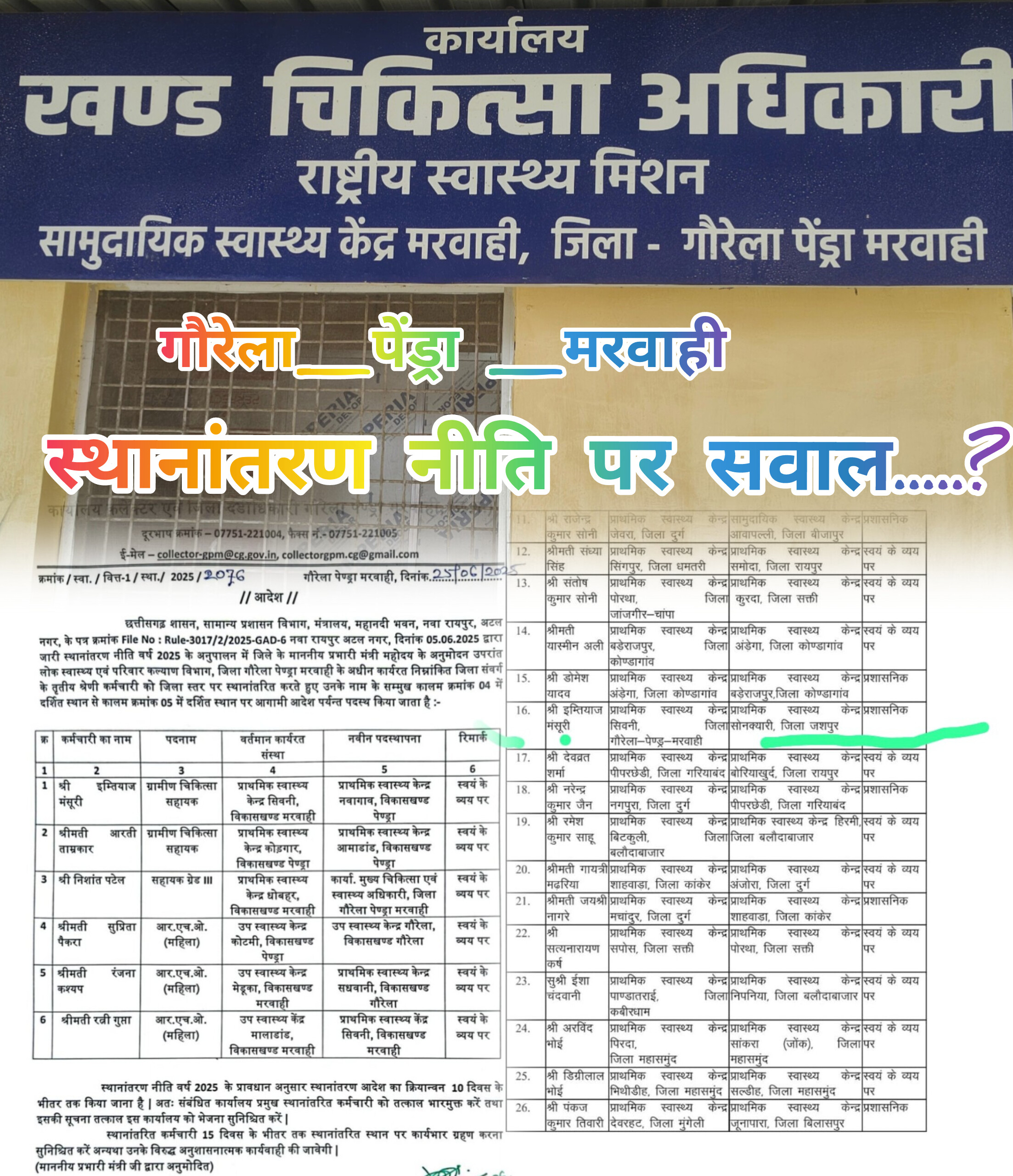 गौरेला-पेंड्रा-मरवाही_स्वास्थ्य विभाग की स्थानांतरण नीति पर एक बार फिर गंभीर सवाल उठ खड़े हुए हैं। ग्रामीण चिकित्सा अधिकारी इम्तियाज मंसूरी के मामले ने न केवल अधिकारियों की कार्यशैली बल्कि शासन के आदेशों की गंभीर अनदेखी को उजागर कर दिया है।