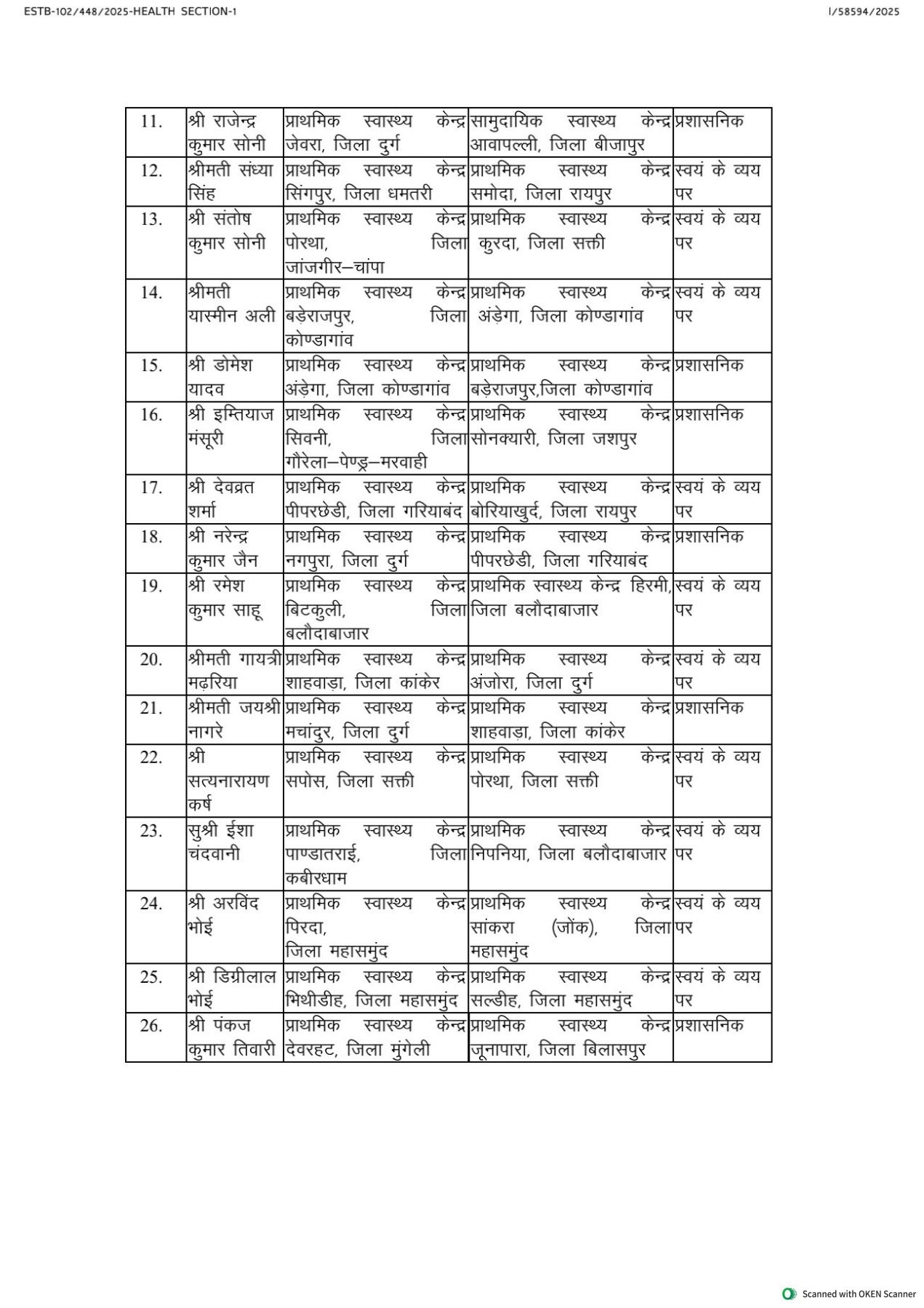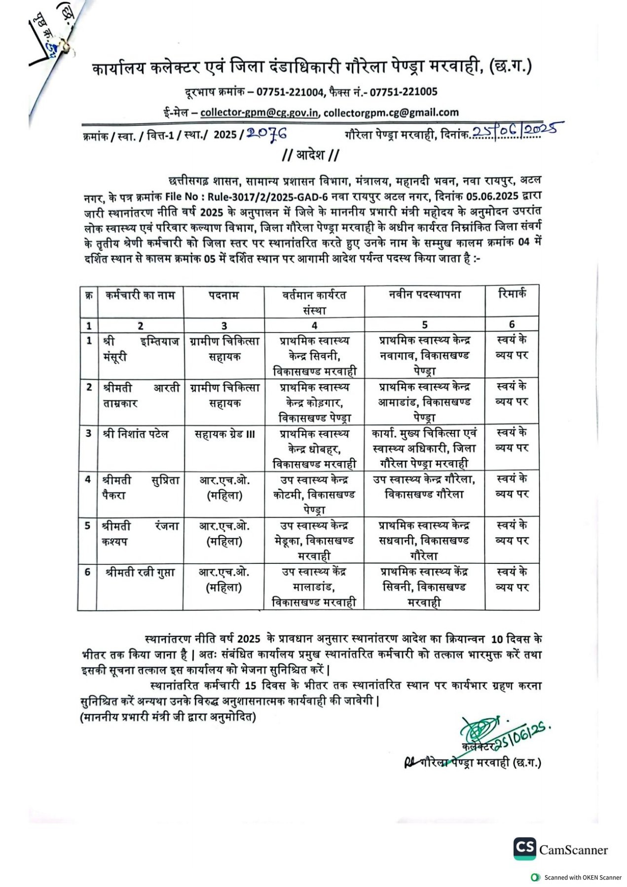मात्र एक दिन बाद 26 जून 2025 को स्वास्थ्य विभाग द्वारा उनका प्रशासनिक स्थानांतरण आदेश जारी करते हुए उन्हें प्राथमिक स्वास्थ्य केंद्र सोनक्यारी, जिला जशपुर पदस्थ किया गया। शासन का आदेश स्पष्ट होने के बावजूद मरवाही बीएमओ डॉ. हर्षवर्धन मेहर ने उन्हें कार्यमुक्त नहीं किया।