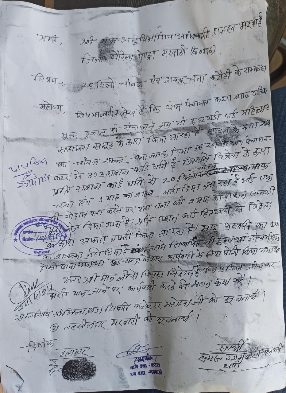 रायपुर/छत्तीसगढ़ के गौरेला पेंड्रा मरवाही जिले के निवासरत लोग आज भी अपने मूलभूत सुविधाओं के लिए दरबदर भटक रहे हैं,आदिवासी बाहुल्य आंचल क्षेत्र अंतर्गत ग्राम पंचायत कटरा के शासकीय उचित मूल्य दुकान कि संचालन जय मां कुदरगढ़ी महिला स्वसहायता समूह के द्वारा किया जा रहा हैं,शासन प्रशासन आमजनों के बेहतर सुख सुविधा के लिए बड़े पैमाने पर कई सारे दावे कर रहीं हैं।लेकिन उसके बावजूद भी ग्रामीणांचल कि जमीनी हकीकत आखिर कुछ और ही बयां कर रही हैं। हम बात कर रहे हैं ग्राम पंचायत कटरा के उचित मूल्य दुकान को संचालन करने वाली जय मां कुदरगढ़ी महिला स्वसहायता समूह कि,समूह के खिलाफ ग्राम पंचायत कटरा के जनप्रतिनिधियों सहित ग्रामीणों ने खोला मोर्चा।समूह के ऊपर ग्राम पंचायत कटरा के सरपंच श्रीमती इंदुदेवी पाव सहित ग्राम वासियों के द्वारा राशन का अफरा तफरी करने का गम्भीर आरोप लगाया गया है,
