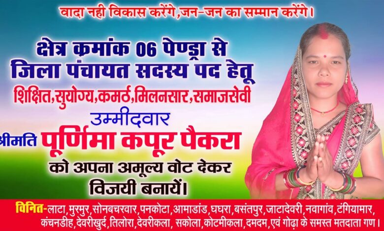 जिला पंचायत सदस्य क्षेत्र क्रमांक 06 पेंड्रा से आपकी बेटी,आपकी बहू ,पूर्णिमा कपूर, चुनावी मैदान में उतर चुकी है।