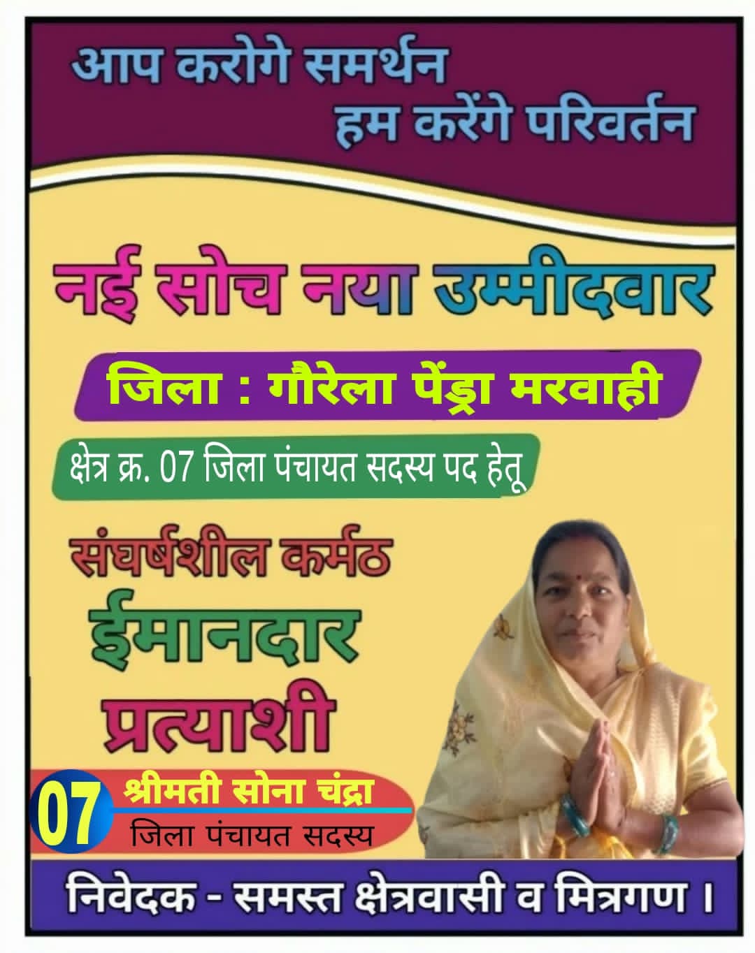 ऐसे सराहनीय कार्य करने वाले लोकप्रिय मिलनसार,शिक्षित,कर्मठ,जुझारू,समाज सेविका,श्रीमती सोना बाई चंद्रा को क्षेत्र क्रमांक 07 जिला पंचायत सदस्य में अपना अमूल्य वोट देकर , सेवा करने का मौका दे।