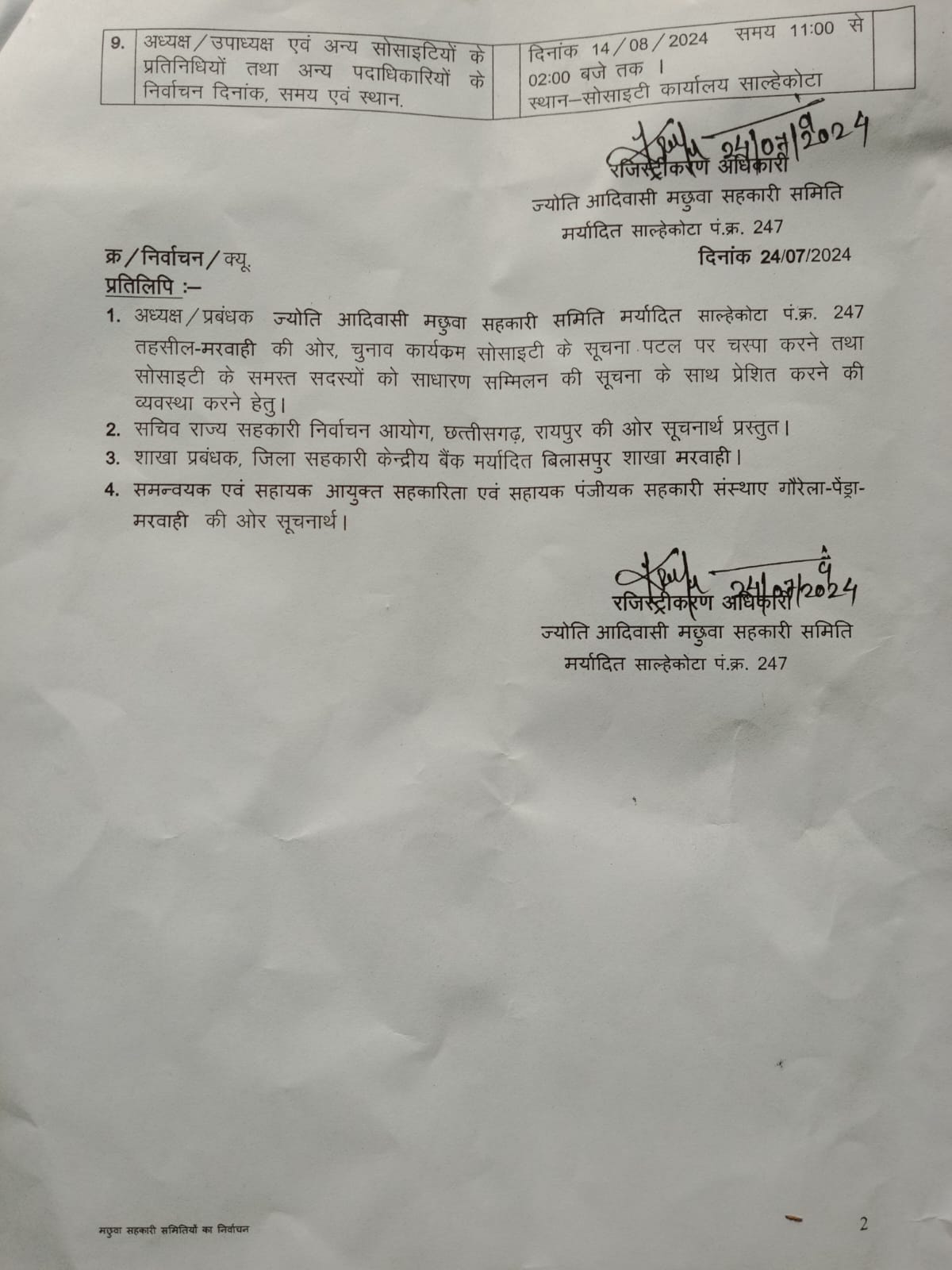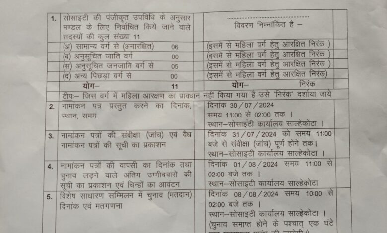 आपको हम बता दें कि समिति की विशेष साधारण सम्मिलन दिनांक 8.8.2024 को दिन 10:00 बजे से स्थान सालेकोटा पर आयोजित की गई है जिसकी अध्यक्षता रिटर्निंग अधिकारी द्वारा की जाएगी जिसमें आप सभी लोगों की उपस्थिति प्रार्थनीय है